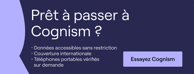 Cognism est un outil d'intelligence commerciale B2B. Vous accédez via la plateforme aux données des entreprises et des contacts : numéros de téléphone mobile vérifiés, adresses e-mail, mais aussi données d'intention d'achat et technographiques.